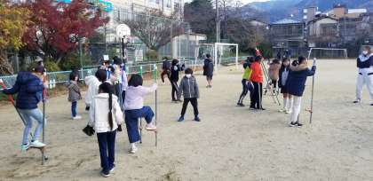 低学年から高学年まで、子どもたちは大喜びで何度も何度も竹馬に取り組んでいます。