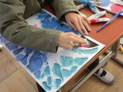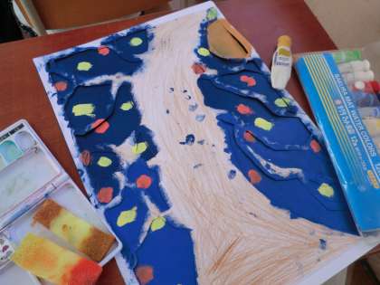 夜のイメージで背景の色をつけたら、モチモチの木に灯った光を入れていきます。