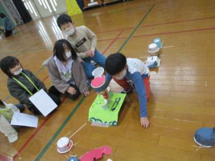 カップの底にある電池を輪ゴムで巻いて、コロコロ進む仕組みを使って車のおもちゃを作りました。