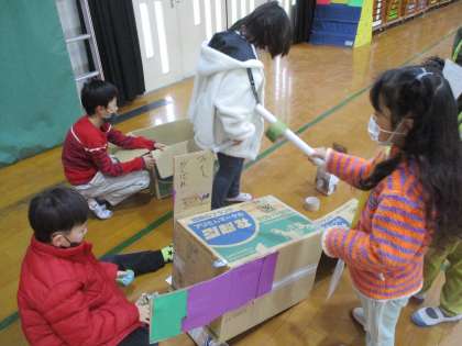 ガムテープの芯に粘土を付けて動かすと、ゆらゆら揺れるという仕組みを使っておもちゃを作りました。