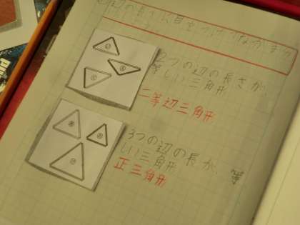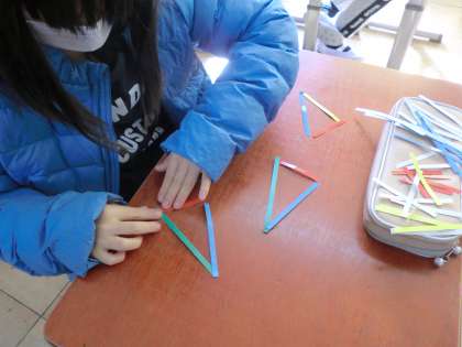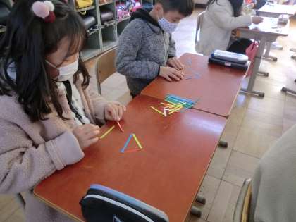 今日は色ぼうを使って、様々な三角形を作り、それらを仲間分けし、「二等辺三角形」や「正三角形」という名前を知りました。