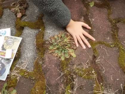 中庭では、タンポポの葉が地面に広がっていることや畑のヘチマが枯れていることなどを見つけて記録していました。