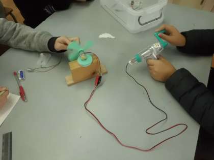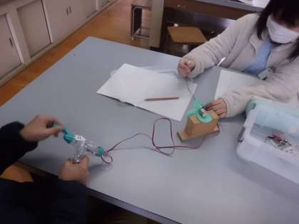 手回し発電機を回して電気を作り、豆電球やモーターにつないで明るさや回る速さがどのようになるかを調べました。
