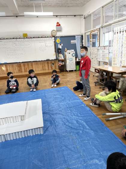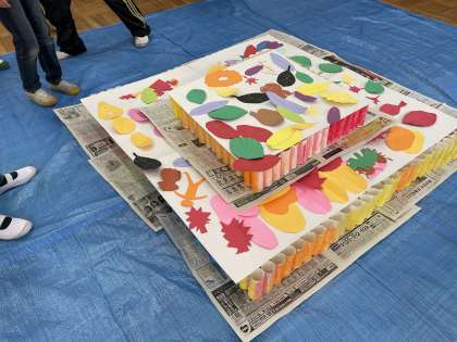 その後、作品を展示する台に色を塗ったり、折り紙をはったりしました。