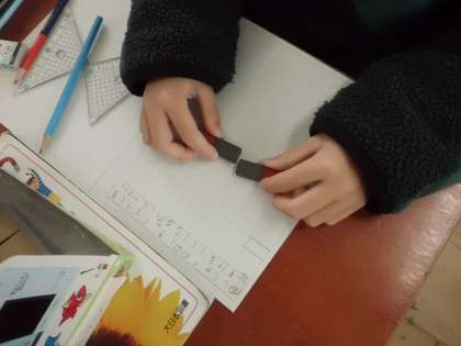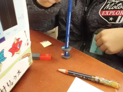 学習したことを利用して、リング型の磁石を重ねてみると、同じ極どうしが向かい合うときには、上の磁石が宙に浮いて不思議がっていました。