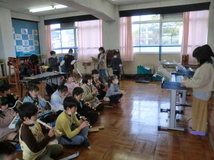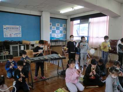 リコーダーだけではなく、鍵盤ハーモニカや低音楽器、リズム楽器、鉄琴を合わせて合奏を楽しんでいます。