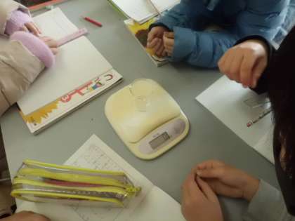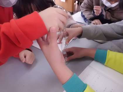 水のようにはかりに直接乗せることができないものの重さを計りました。