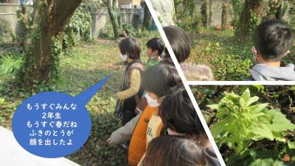 春みつけをしていると、学校の庭にふきのとうが顔を出していました。