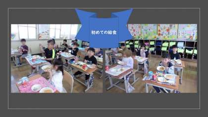今日から子どもたちが楽しみにしていた給食が始まりました。「牛乳が苦手です。」「野菜が苦手です。」と朝から心配そうに話していた子もいましたが、食べ始めてみると、「なんかおいしいわ。」「このほうれん草おいしいから、お替りできそう!」と嬉しそうに話し、完食していました。栄養満点の給食を食べて、ぐんぐん大きく成長してくださいね。