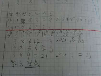 3年生になって最初の学習は、2年生の九九の復習でした。九九の表をもとにすれば、九九にない「3かける10」などの答えも求めることができます。ノートには自分の考えを文字で書けるようにしたいです。自分なりの答えの導き方を文章にすることで、人に説明することができます。毎時間の積み重ねが大事です。