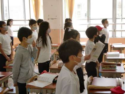 「花束をあなたに」という曲の歌詞を聴き取りました。聴くごとに聴き取った歌詞を書き、4回目ですべての歌詞を聴き取ることができました。その頃には曲をくちずさめるようになっています。楽譜にはどんな感じで歌いたいかなどを書きこみ、4年生のきれいな歌声が教室に響きました。これまで十分に歌えなかった分、楽しく歌っていきたいです。