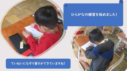 ひらがなの学習を始めました。初めは、なぞり書きが中心ですがみんながんばっています。鉛筆の持ち方や姿勢を確認した後、丁寧になぞっていました。毎日、一文字ずつ練習していきましょう。