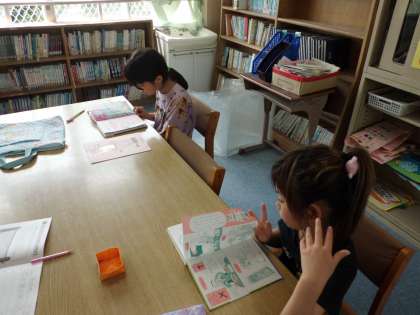 2年生になってはじめて図書室に行きました。新しい学校司書の今西先生から本の借り方や図書室での過ごし方などを教えていただきました。その後、自分の好きな本を選んで読んでいました。