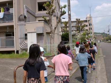 学校のまわりのようすはどのようになっているのだろう、どんな建物やお店があるのだろう。自分の住んでいる場所の周辺だけでなく、池田校区全体の地図を見ながら学習を進めています。昨日、今日は実際に校区を歩き、自分たちの目で確かめに行きました。山科川を中心に西には住宅が多く、東には大きい道路や店があることに気がつきました。校区の地図にまとめていきます。