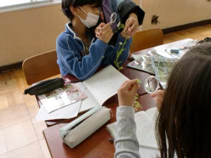 虫めがねを使って、草花をさらに詳しく観察しています。葉のかたちや付け根はどうなっているのか・・・そんなところまでしっかりと見て、「似ているところ」や「違うところ」を探っていきます。