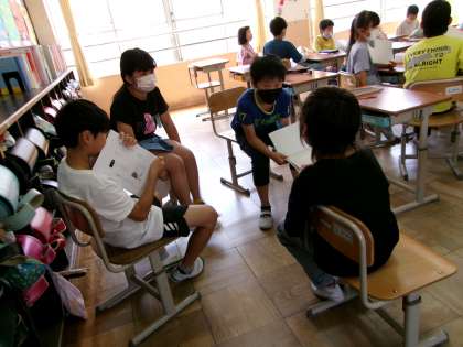 白いぼうしの学習も終盤になってきました。今日は問いに対して考えたことをグループで伝え合いました。叙述に即した読み取りをして、自分なりの考えをワークシートに書いて発表することができていました。