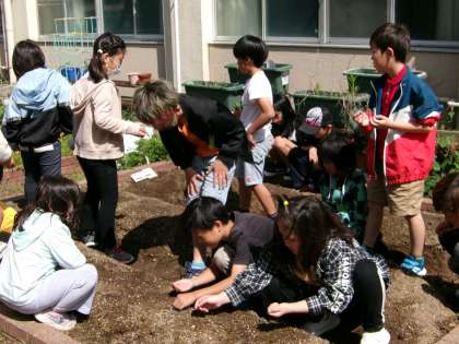 理科で栽培する「ダイズ・オクラ・ホウセンカ・ひまわり」の種をじっくり観察したのち、今日は学年の畑にたねまきをしました。