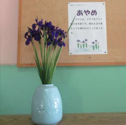 地域の方からあやめの花をいただきました。みんなに見てもらえるように、わくわく広場に飾っています。子どもたちに自然に親しんだり興味をもったりして欲しいです。