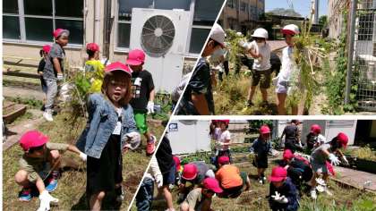 生活科の学習で、夏の花や野菜を育てます。その準備で、2年生と一緒に畑の草抜きをしました。2年生は、草を抜くスピードもはやくて、1年生は「すごーい」と歓声をあげていました。これから、いろいろなことを教えてもらって、上手にお花を育てましょう。