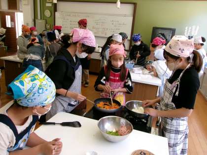 今日の家庭科の学習は待ちに待った調理実習でした。野菜炒めに挑戦です。ニンジンの短冊切りや玉ねぎの皮むきに苦戦している班もありましたが、どの班も協力しておいしく作ることができました!ぜひ家でも作ってみてほしいと思います。