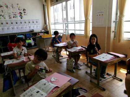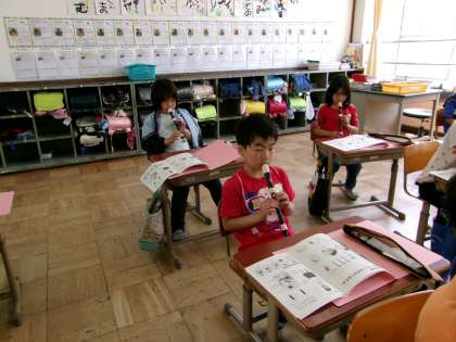 まずはリコーダーと仲良くなろうということで、あなの数を数えたり、ジョイント部分だけで音を出してみたり、リコーダー語を言ってみたりしました。持ち手や姿勢に気をつけて、初めて吹いた「シ」の音。慎重に音を出したからこそ、きれいな音色が出せました。これからの学習が楽しみです。