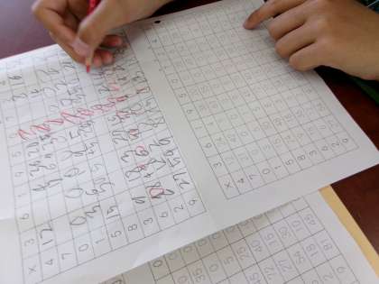 掃除後の15分は午後からの授業に備えてぐっと集中して取り組む時間です。月・水は計算の日。今は100マスかけ算に取り組んでいます。やり始めた頃より、できる数が増えた人、タイムが伸びた人、正解率が上がった人、それぞれが「前回の自分」を上回れるように頑張っています。