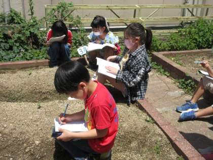 5月初めに植えた植物からだんだんと芽や子葉が出てきました。繰り返し観察カードを書くことで、だんだんと上手に書けるようになっています。定規をあてて大きさを正確に測ることができていました。