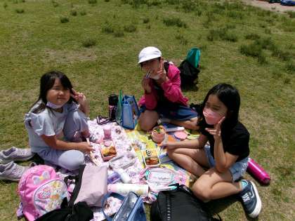 お弁当タイムです。心地よい天候の中、野外でシートを広げ食べるお弁当は最高です。