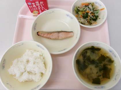 今日の給食は、ごはん・牛乳・さけの塩こうじ焼き・小松菜と切り干し大根のにびたし・みそ汁でした。さけの塩こうじ焼きは、子どもたちから大人気で「さけおいしい!」という声がたくさん聞こえました。