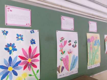 4年生になって、また絵の具の使い方や絵全体の構図に磨きがかかっています。すてきな花がずらっと並び、とっても明るい4年生の教室です。それぞれがどんなまぼろしの花を作成したのかもよくわかります。