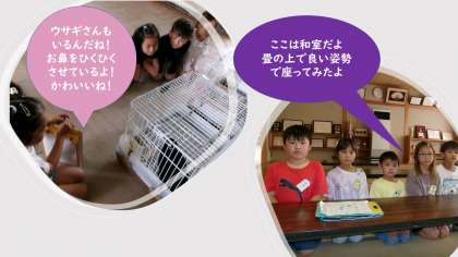 ウサギがいる部屋にも行きました。びっくりさせないようにそっと教室に入って、ご挨拶しました。「かわいいね!」「お鼻がひくひく動いているよ!」みんなの顔が自然と笑顔になっていました。和室にも行きました。和室には、畳の上でいい姿勢で座ってみました。「畳のにおい知ってる!」「ここで、お抹茶が飲めたらいいね!」と話していましたね。