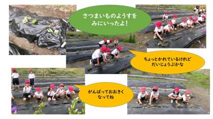 雨が上がったので、さつまいもの様子を見に行きました。「葉っぱがかれてきてるよ」と心配そうな声が。帰りには「また、来るから、頑張って大きくなってね!」と声をかけていました。明日は雨予報。月曜日にまた見に行きましょう。