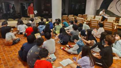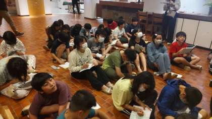 今日一日の振り返りをしています。みんなの五分前行動のおかげで、予定より早く始めることができました。