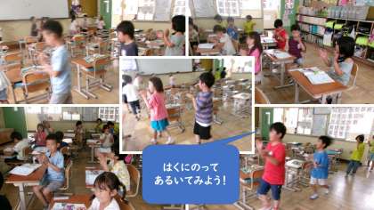 音楽の学習では、リズムにあわせて手拍子をしたり、手拍子しながら歩いたりして「はく」の違いを感じています。「たん・たん・たん」や「たん・た・た・たん」といった感じです。リズムを感じて体を動かすことが大好きな1年生です。
