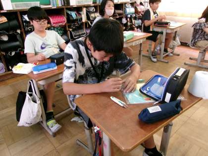 いよいよ裁縫セットを使用しました。今日は針に糸を通し玉結びを練習しました。玉結びの映像を見て、いざチャレンジ!苦戦している友達に教えてあげる子もいて、5年生のやさしさが表れた瞬間でした。