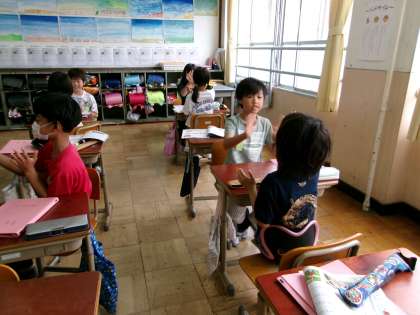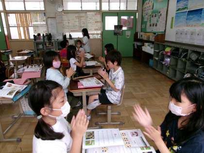 リコーダーの時間が続いていましたが、久しぶりに「茶摘み」を歌って手遊びを楽しみました。4小節ごとに2人の手を合わせるタイミングがあり、そこで「トン」とできると思わず笑顔になっている子どもたちでした。歌いながら手遊びは難しいところもありますが、はくにのって音楽に親しめました。