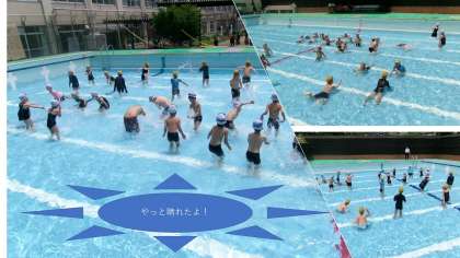 超低水位の水慣れの学習も今日で最終日でした。今日は、初めてお日様が出てくれました。「暑いから気持ちいいな!」「もっと入っていたい!」と、これまでの学習で一番笑顔が弾けていました。明日からは、少し水位が上がります。気温も上がるといいですね。