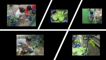 朝顔の葉っぱが大きくなってきました。お隣の友だちと重なり合ってきたので、広い場所に移動しました。「もっとおおきくなあれ。」と言いながら、優しくお水をあげていました。