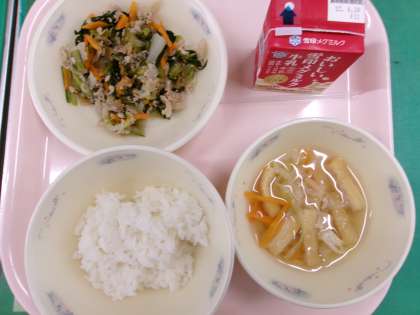 今日の給食は、牛乳・ごはん・豚肉と小松菜の梅いため・キャベツのすまし汁でした。豚肉と小松菜の梅いためは、新献立でしたが、子どもたちは「少しだけすっぱくておいしい」とたくさん食べていました。