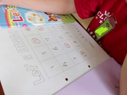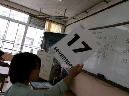 1〜20の数の言い方にずいぶん慣れてきました。いろいろな持ち物の数を尋ね合ったり、ビンゴゲームをしたりして英語に親しんでいます。ビンゴゲームは「運」ですが、出てほしい数字が出ると大喜びしていました。