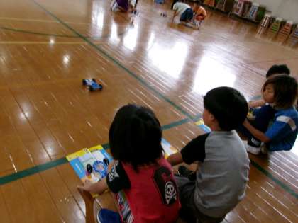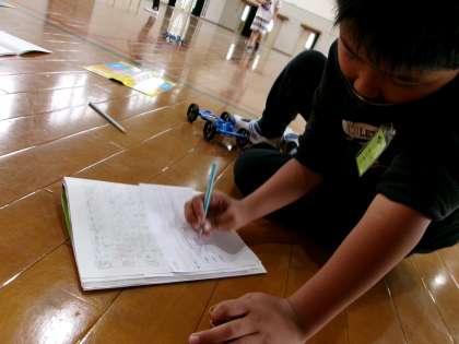 今日はゴムを長くひいたときと、短くひいたときで車の走る距離がどのように違うのかの実験をしました。体育館を広々と使用し、同じ実験をそれぞれ3回ずつします。3回するのはなぜなのか、ということも分かって取り組むことができました。