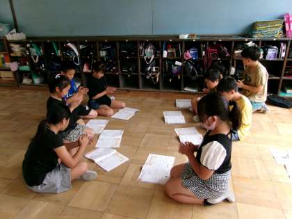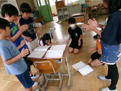 楽しいマーチの仕上げにグループでリズムを重ね合わせることを楽しみました。拍のずれや呼びかけと答えなどもみんなで打ってみるとよくわかったようです。最後にグループ毎に発表しました。