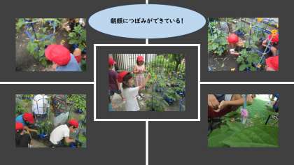 毎日大切にお世話している朝顔に、つぼみがたくさんついてきました。「先生!僕の咲いているよ!」朝にはつぼみだった朝顔が、帰りの時間に咲いていました!初咲きです!月曜には、もっと咲いているかな。楽しみに学校にきてくださいね。