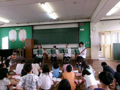 リコーダーアンサンブル「ピッコリーナ」さんが演奏をしに来てくださいました。みんなの使っているソプラノリコーダーの仲間をたくさん紹介してくださったり、実際に音を聴かせてくださったりもしました。ピタゴラスイッチや茶摘みなど知っている曲もたくさんあり、興味津々、身を乗り出して聴いていました。