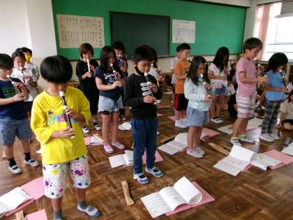 ピッコリーナさんの演奏の合間に、3年生・4年生もそれぞれ授業で取り組んでいるリコーダー曲を演奏しました。まだ「シ」と「ラ」だけを練習している3年生は4年生の2重奏「よろこびのうた」を聞いて自分たちもあんなふうに吹けるようになりたいと思ってくれていたことだと思います。楽しくてあっという間に時間がたちました。