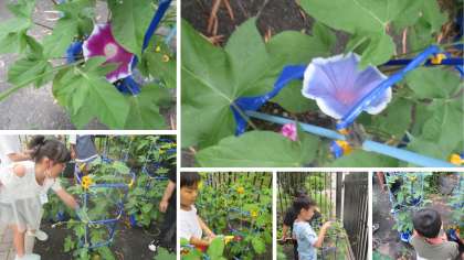 週明けの月曜日。数名の子どもたちの朝顔の花が咲いていました!「薄い水色やった。」「紫の花が咲いたよ。」と色も様々で大喜びでした。まだ咲いていない子どもたちは、つぼみの数を数えていました。明日もたくさん咲くと良いですね。