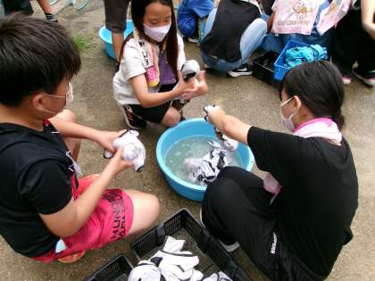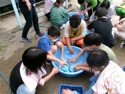 6年生の家庭科では洗濯について学習しています。洗濯の記号や洗い方について学習した後、実際にビブスを洗濯しました。体育や部活で使っているビブスは、一見するときれいです。しかし、たらいに入れて洗ってみると、みるみるうちに水が汚くなりました。一生懸命洗って、キレイになったビブスに、子どもたちは満足そうでした。