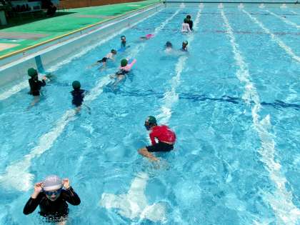 今日は4年生が海の家に行っていて3年生だけでの水泳学習です。プールがとても広く感じます。いつも通り、水慣れをしたのち、距離別に泳ぎを練習します。少しでも長く泳げるように泳ぎ始めは壁をけること、体をまっすぐにのばすように浮くことを意識して練習しました。外気温がとても高かったので水の中は気持ちがよさそうでした。水分補給もこまめにしながら泳ぎました。