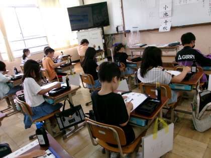 自分の名前のお手本を見ながらそっと小筆を動かします。力の入れ具合、墨汁のつけ具合を調節して練習をしました。次からは、作品に名前を書けますね。