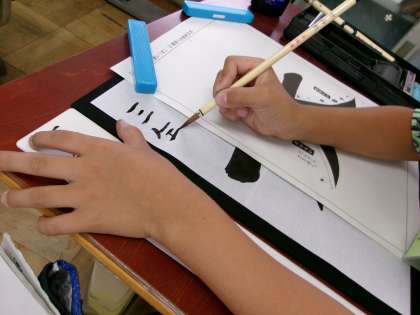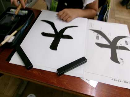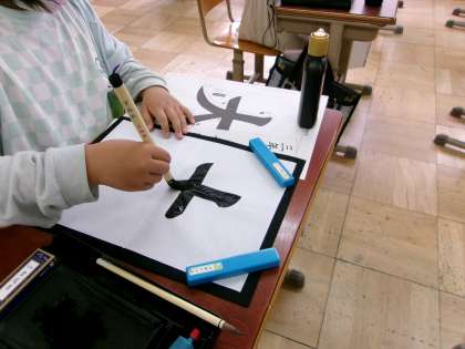 今日は右はらい、左はらいの入った「大」という文字に挑戦しました。初めははらいの練習から。みんな筆の持ち方ばっちりで集中して練習しました。なぞり書きをした後、集中力を高めて清書しました。